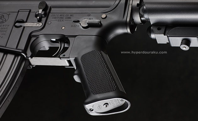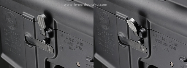 左側面にはライブになったボルトリリースボタンがある。またセレクターは従来どおりだが、若干操作の感触が重くなり、しっかりとしていて良い。できればフルオートシアピンやハンマーピンもモールドではなく別パーツが良かったが、それは望みすぎというものだろう。