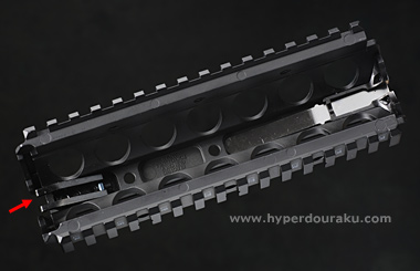 RASアッパーの裏側。矢印の部分がリア側にあるバレルナットに固定されるツメ。
