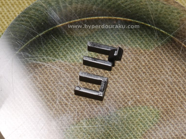 下が折れた爪パーツでコの字型の中ほどから伸びる爪部分が根元からパッキリと折れているのがわかる。