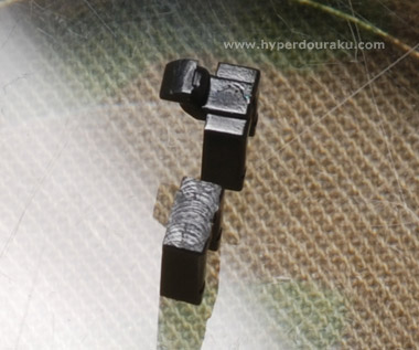 パーツを別角度から見てみると、あれ? 爪の根元の形状がマルイから送られてきたものとちょっと違う。出っ張りがないというか、爪が根元から折れたとしても出っ張りは残っていてもいいはずだ。しかも折れたほうには機械加工のような円弧状の痕がある。