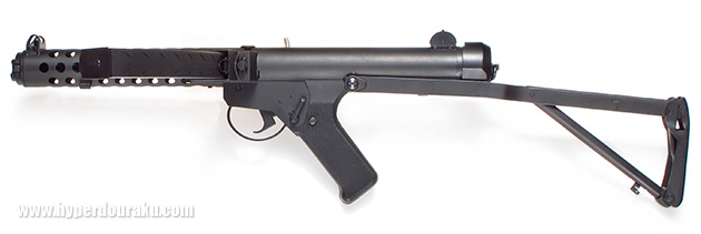 ボディはスチールプレスでガッチリした造りとなっており、バレルジャケットには放熱孔が多数あり、これがまたカッコイイのです。複雑な構造の折り畳み式ストックも完全再現されており、スチール製でグラグラ感はまったくありません。実銃の雰囲気を余すところなく忠実に再現しています。