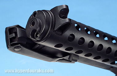 バレルは中心にありますが、マズルヘッドの一段高くなった部分は中心ではなく左横にズレています。スクリュー用の切り欠きがある独特の形状です。後述しますが、折り畳んだストックはバレルジャケットの放熱孔にロックできるようになっています。