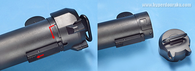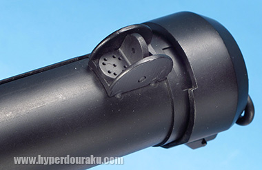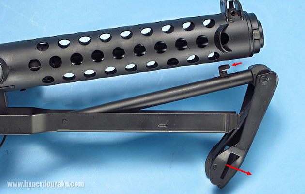 ストックの展開方法。ストックを折り畳んだ状態のバレルジャケット側のアップです。