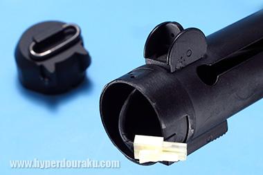 バッテリーは本体内に収納します。しかしメカボックスも入っているので、径は太いのですがバッテリースペースは狭いです。バッテリーは全長10cm以内のモノを使わないとはみ出てしまいます。