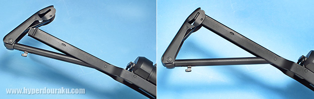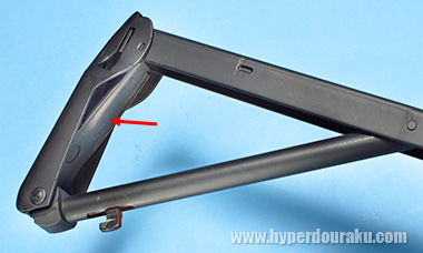 まず始めに、ストックエンド(バット部)を引き起こします。ストックパイプにあるカギ状のパーツが後退し、鍵爪状のロックが外れます。