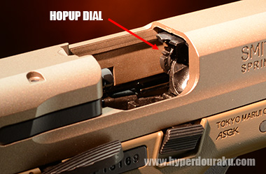可変ホップアップダイヤルはチャンバー横にあり、スライドを分解しなくても調節可能。