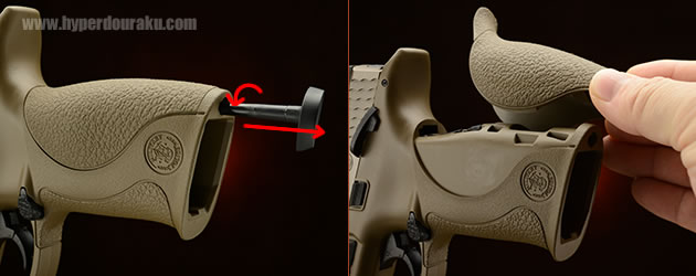 パームスウェルの交換は、まずマガジンを抜き、フレームパーツと呼ばれるグリップ底部のつまみを90度回して引き抜く。するとパームスウェルが取り外すことができる。サイズはS/M/Lの三種類から選べる。