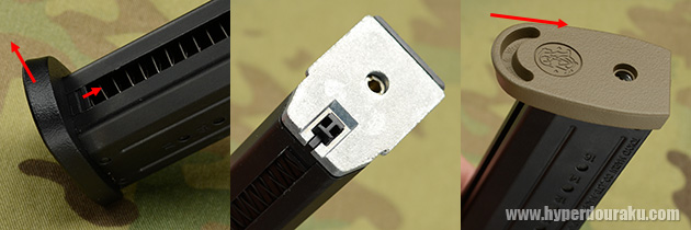 Vカスタムのパッケージに同梱するFDEマガジンバンパーを黒のバンパーと交換する。マガジンフォロアーを上へ持ち上げてバンパーを前方へ引き抜く。あとはFDEのマガジンバンパーをカチッとロックするまで差し込めばOK。