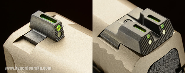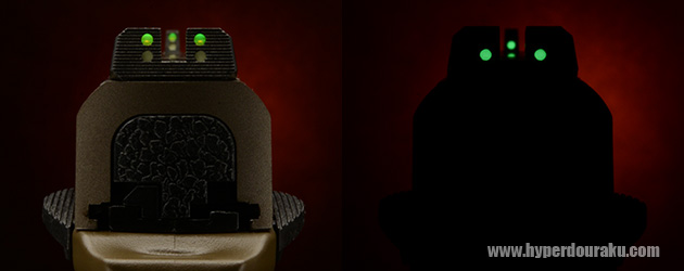 明るいところでは上部の集光チューブが光を集めドットが光る。やや薄暗い場所でも光を集めて明るく見えるのでサイティングしやすいが、全く光がない暗闇だと集光チューブは使用できない。そこで下段の蓄光サイトが活躍する。