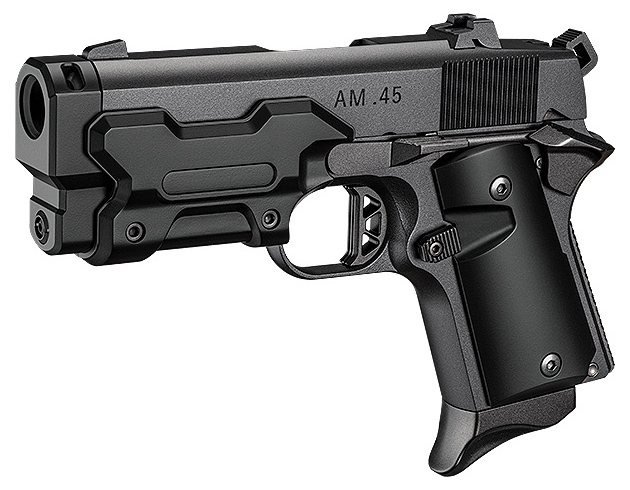 サブコンパクトクラスのカスタムハンドガンが欲しい人はこのブラックモデルのAM.45は選択肢に入るだろう。ただし、アンダーマウントレイルを搭載していないのでウェポンライトがつけられないのと、マズルガードを外さないとならないホップアップ調整が少々面倒、独自の形状のためホルスターを選ぶという点が難点でもある。