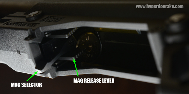 なお、マガジンセレクターレバーは実銃では左右のチューブマガジンを切り替えるためのものだが、マルイのKSGでは可動はするがダミーとなっている。