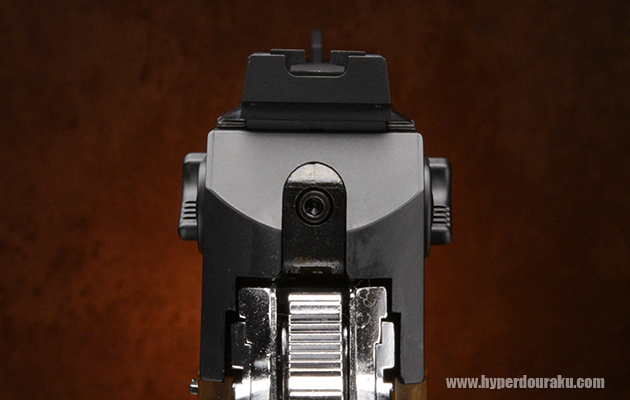 操作系が集中するゴツゴツとしたハンマー回り。スライドには新形状のアンビタイプ セフティレバーがある。リアサイトは上下左右の調整が可能なアジャスタブルタイプだ。