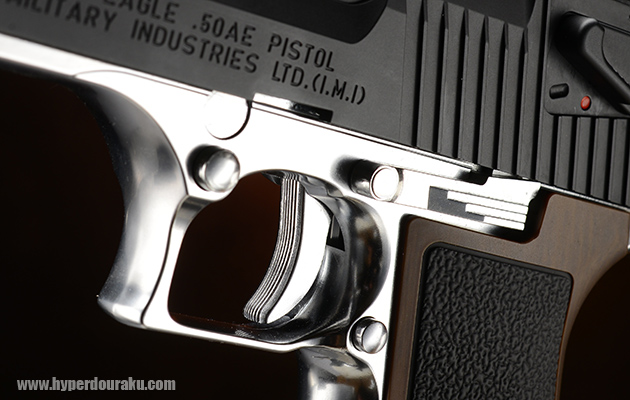 ホールドオープンすればバレルは動かずに後部のスライドのみが後退する仕組み。実銃のデザートイーグルでもあるロッキングラグもリアルに再現される。