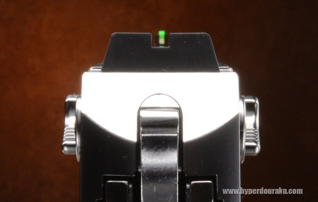 フロントサイトは上が角型のグリーン集光アクリル、下が蓄光タイプのコンビネーションサイトが採用されている。