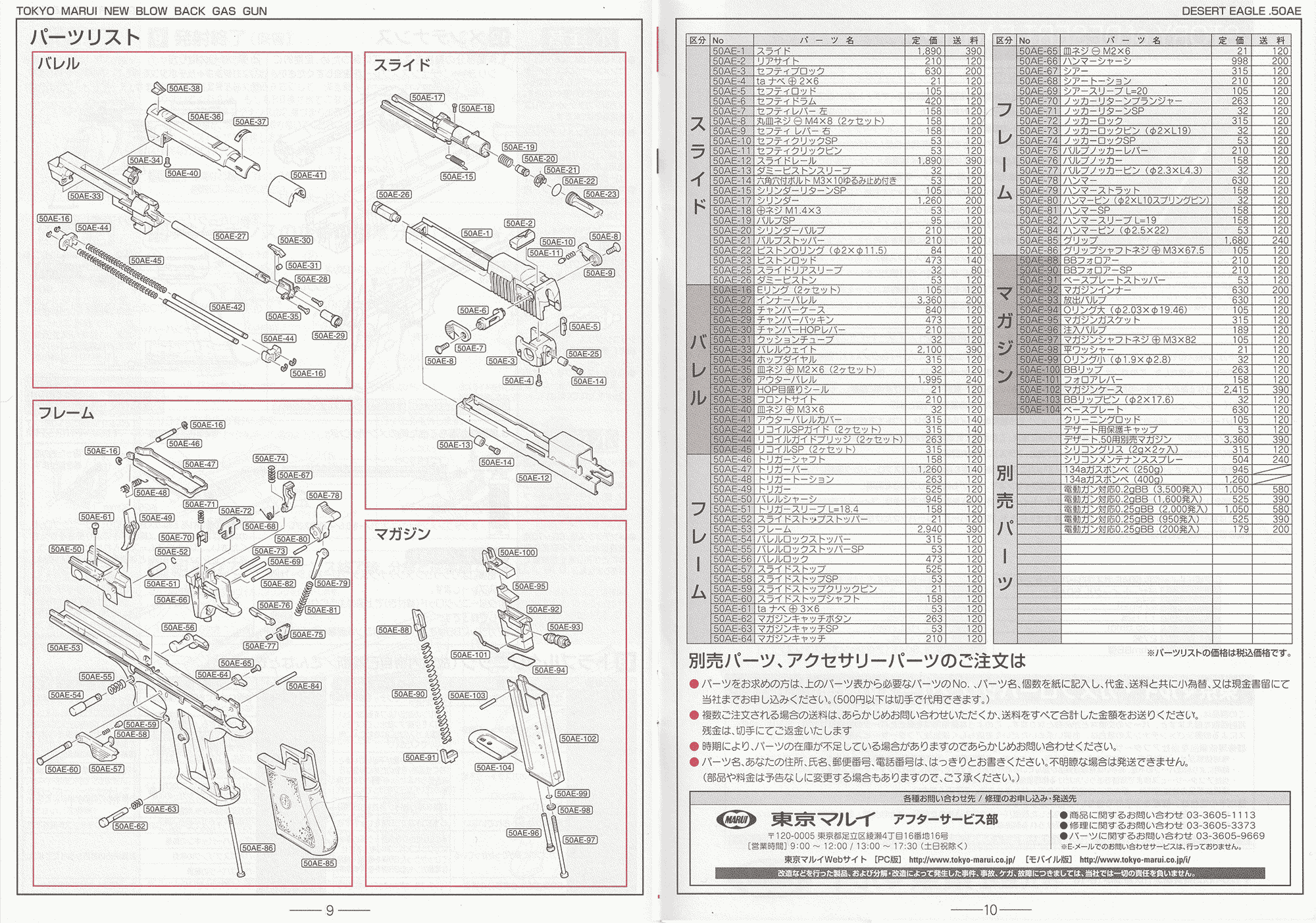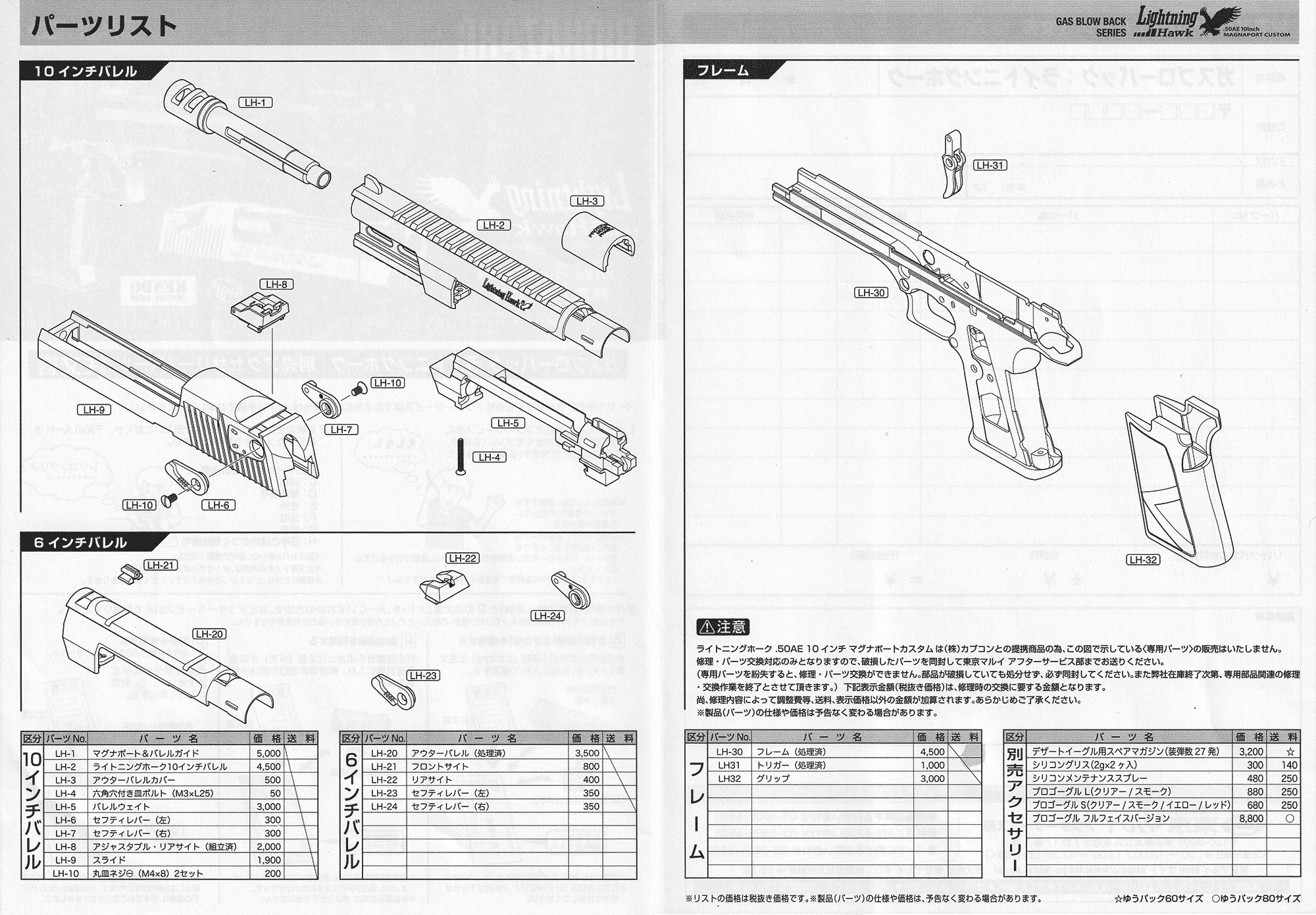 パッケージ内容は、本体(10インチバレルスライド付き)、6インチバレルスライド、マガジン(装弾数27発)、弾薬箱、保護キャップ、取扱い注意・説明書、解説書、補足説明書、クリーニングロッド、他。