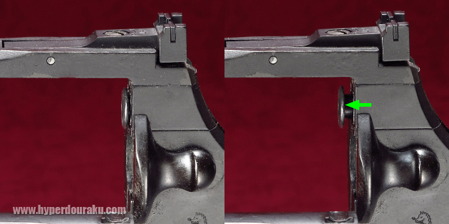 ハンマーの横にマニュアルセフティがあります。実銃にはセフティがないため、ガスガンオリジナルの機構です。この状態で「FIRE」、レバーを前にして「SAFE」です。
