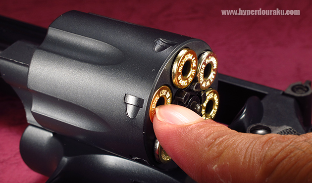 ハンマーを起こすとガス放出ノズルが付き出て、シリンダーのダミーカート底部を押し込み、密着するようになっています。