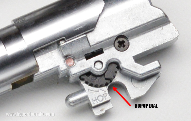 可変ホップアップのダイヤル。スライドを外さないと調整できないのは不便だが、大きく狂うこともない。