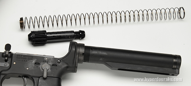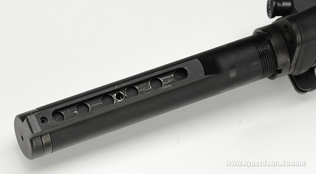 ストックはM4カービンおなじみのエンハンスド・リトラクタブルストック。バッファチューブ径は実測で28.97mm。実物コルトの同ストックも取り付けられた。
