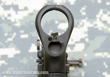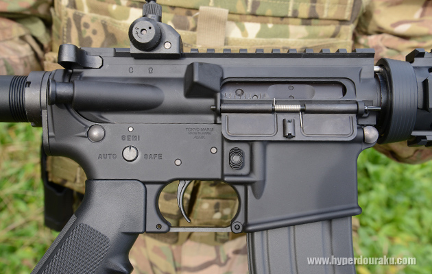 ボルトキャッチ下側を押しながらチャージングハンドルを引けばボルトをホールドオープンできるのも実銃同様。また、ホールドしたボルトをボルトキャッチではなく、チャーハンを引くことでリリースすることもできる。