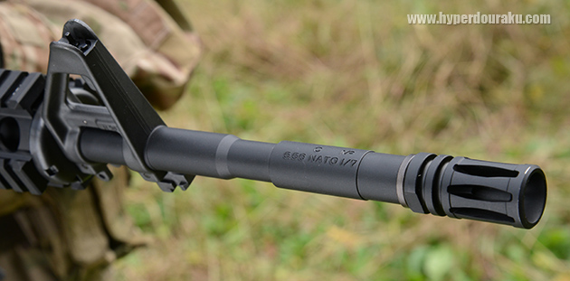 アウターバレルはアルミ製で軽量、弾薬の刻印もあるが、アルマイト処理の色はまっ黒。もう少し焼けたグレーのような色が好み。A2バードケージタイプのフラッシュハイダーはアルミ削り出し。M14逆ネジ仕様。電動ガンなどにみられた下部のイモネジ固定ではなく、Oリングによる固定になったのは嬉しい。