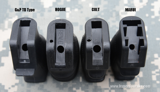 グリップ基部の形状比較。マルイのグリップは肉抜きされているが固定面のサイズは一緒なので実銃用グリップもガスブロAR用も一通り装着可能。ただし、ホーグのみ、グリップ幅が厚めでセレクターに少し干渉した。マルイとコルトを比べるとフィンガーチャンネルの形状がやや異なり、このためか握った時にほんの僅かにコルトとマルイでは印象が異なる。