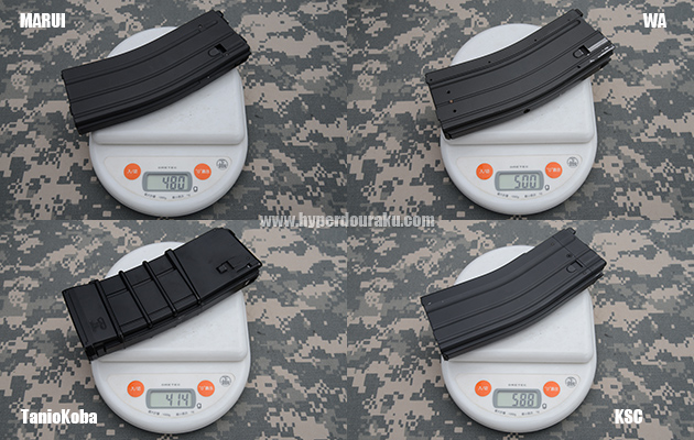 国内4メーカーのガスブロM4カービンのマガジンの重量比較。マルイのマガジンは軽いほうだが、装弾数35発、サバゲーで数本持ち歩くことを考えるとタニコバ並みに軽くても良いと思う。