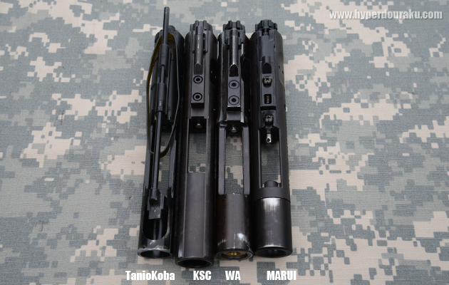 実際のところ、WAはすでにメタルフレーム版が主力だし、KSCは先ごろVer.2が発売されており作動性が改善されているそうなので、各社現行ラインアップでの比較というワケではないのだが、参考までにどうぞ。