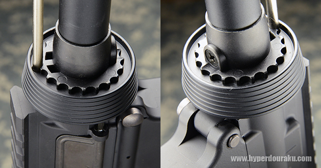 RASは比較的簡単に取り外せる。ハンドガードリングを引っ張りながら底面レールを取り外し、トップレールのネジを一本外せば上側パーツも取り外すことができる。気になるバレルナットの形状はやはり、次世代電動ガンのような形状。バレルナットのギザギザは再現されるが内側部分はRASの爪が掛かる2つ穴しかなく、社外レールを付ける際には制限があるので注意が必要だ。なお、このパーツはバレルダミーナットとパーツリストに記載がある。