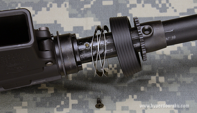 またこのバレルダミーナットはプラスネジ1本のみで固定されており、増締めしてもグラつくので、RASがカタつくのはこれも要因の一つなのかも。ダミーナットを取り外すとハンドガードリングとスプリングが取り外せ、本来のバレル基部ナットが露出する。