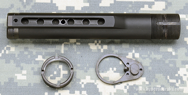バッファチューブを取り外してみる。チューブはアルミ削り出し。キャッスルリング、バッファリングは亜鉛ダイキャスト製。