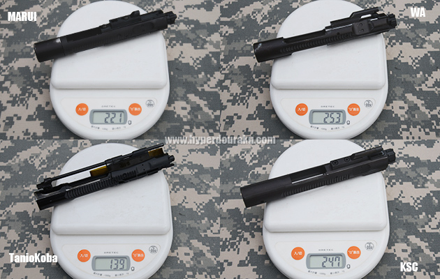 ボルトキャリアの重量比較。リコイルの重さはボルトキャリアの重量に比例している。しかし、ボルトキャリアの移動速度が速いマルイは30gの差を補って鋭いリコイル感がある。