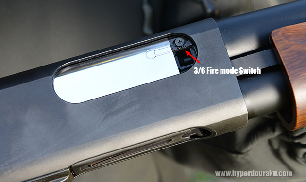 フォアエンドを引くと、チャンバー部がオープンし、3発か6発の同時発射を切り替えられるスイッチがある。スイッチを前にすれば6発、後ならば3発の同時発射となる。