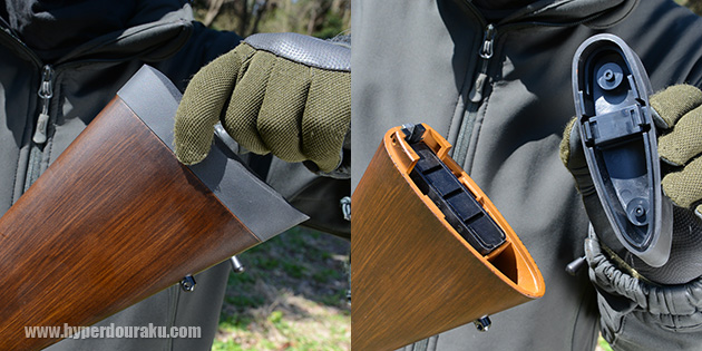 ストックもウッド調の仕上げ。渋い。ベッドサイドに立てておきたくなる。グリップ部も細身で握りやすい。バットプレート部はガスタンク装填用に取り外し可能で、ベースはプラ製だが、ゴムカバーで覆われているので構えた時のフィット感は高い。