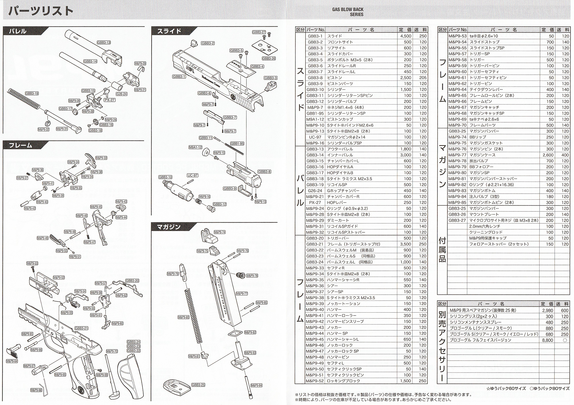 パッケージ内容は本体、マガジン、予備のマガジンバンパー、フォロアストッパー×2、パームスウェル(S/M/L)※Mは本体装着済み、マウントプレート、取付ネジ×2、保護キャップ、六角レンチ、取説、補足説明書、クリーニングロッド、BB弾(0.2g/100発)。