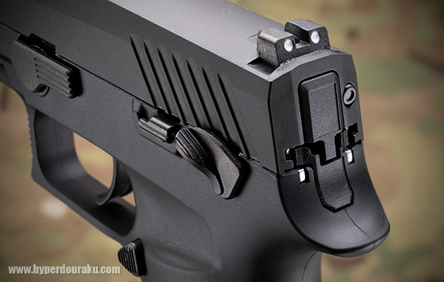 角ばったスライドが新世代のオーマチックピストルをイメージする先進的なデザイン。前後にセレーションの入ったスライド、フレームともに樹脂製で、スライド左側にP320の刻印がある。スライドとフレームでは微妙に塗装の色味を変えてある。スライド素材にはG17 Gen5 MOSで採用されたカーボン入り強化樹脂を使用している。