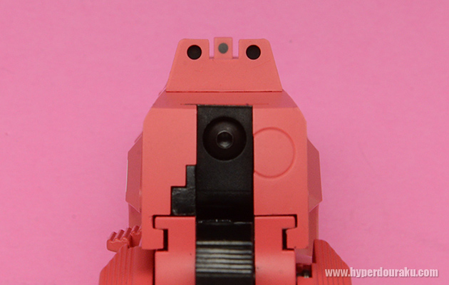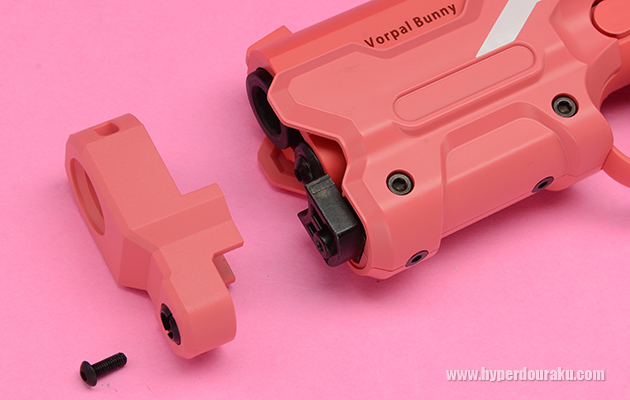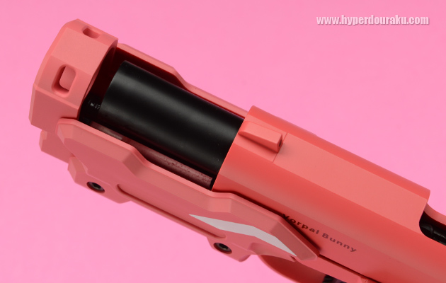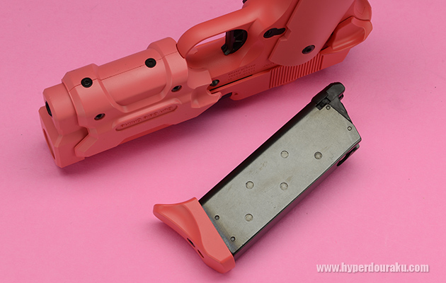 セミロングのスライドストップ、オリジナル形状のサムセーフティ。マグキャッチやハンマーもカスタムパーツとなっている。ハンドガードやグリップパネルはP90バージョンレンを彷彿とさせる明るめのピンク、フレーム&スライドは少し濃いめのピンクと、色はわずかに異なるのもこだわりのひとつだ。