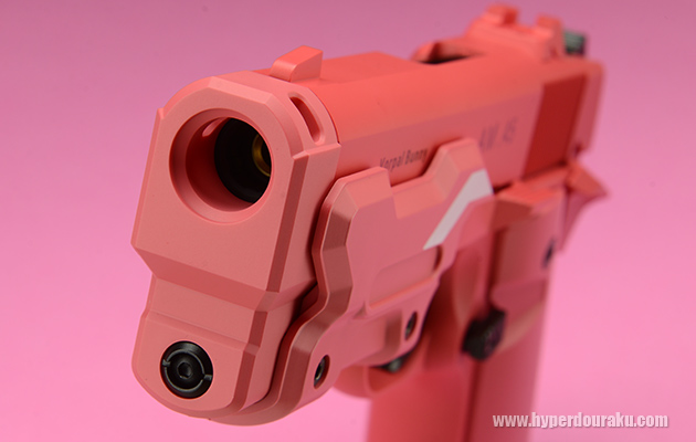 強力な.45口径弾を使用する最新のコンシールドキャリーピストルといった雰囲気、しかも主人公キャラクターが使うド派手なピンクのカラーリング、コレクション要素の高い銃でありながら、高い戦闘力も秘めた実射性能、遊び心と所有感は抜群!! これは是非とも二丁ゲットしてアキンボで撃ちまくりたいガスブローバックガンだ。