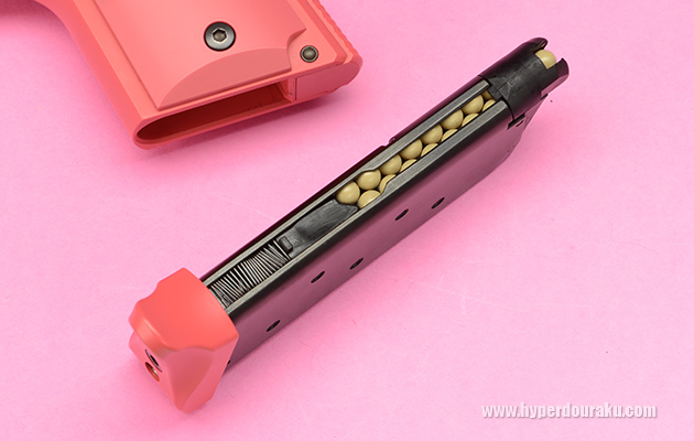 装弾数はデトニクスと同じ18発で、デトニクスや、シングルスタック1911系のマガジンと互換性もある。弾はリップからも前面のスリットからも装填することができる。なお、スペアマガジンも3,200円(税別)で同時発売なので、ハンドガン戦などで多く撃ちたいひとは一緒に買っておくとよいだろう。