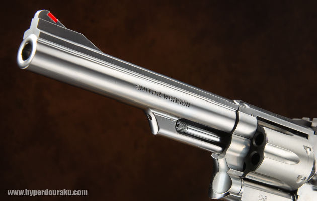 ステンレスシルバーの美しいメッキ、すらりと伸びた6インチバレルのバランスが絶妙に美しい。これは手にして眺めているだけでも楽しめる。カリフォルニア・ハイウェイ・パトロールのリボルバーということでポリスファンなど思い入れのある方にはたまらない一丁だろう。