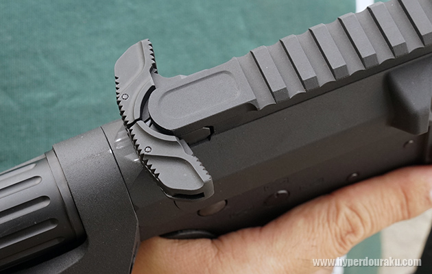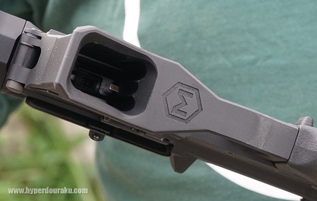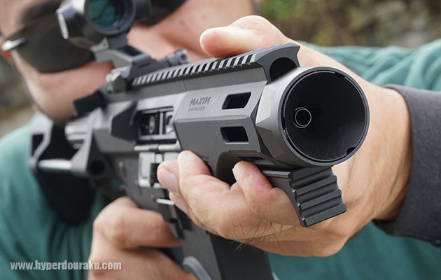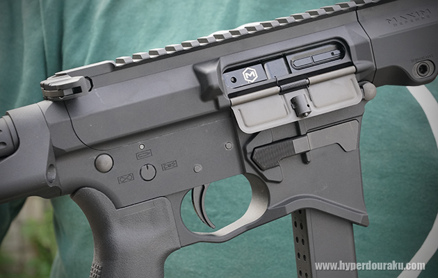 独特な形状のレシーバーはアッパーロア共に金属製。MAXIM Defencseオフィシャルライセンスによる刻印がマガジンハウジングに入り、セレクターのマークはピクトグラムとなっている。