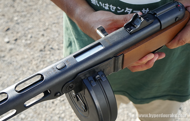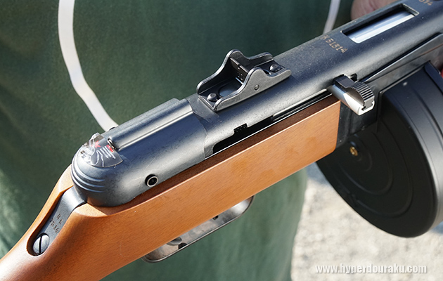 オープンボルト方式なので、ボルトハンドルを比して後退位置にして発射準備完了。ノブには黒いレバーがあり押し込むとレシーバーにロックするセーフティ機能を備える。