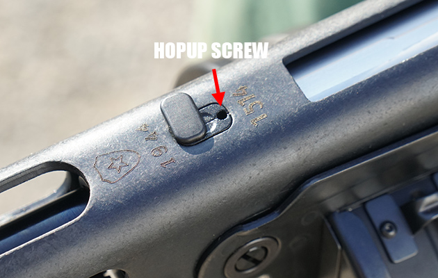 エジェクションポート前の出っ張りを回すと、可変ホップアップの調節ネジ穴が現れる。ここに六角レンチを差し込んで調整する。VFCのガスガンにしてはホップ調整しやすい。