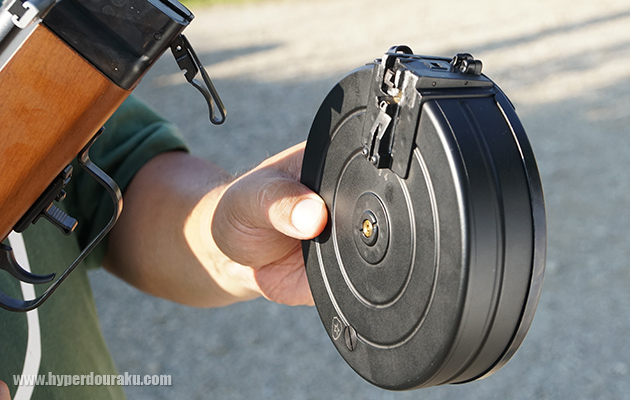 トリガーガード前のレバーがマガジンキャッチ。金属外装の大きなドラムマガジンが特徴。空撃ちモードもあり、中心部にはガス注入バルブがある。ただ、海外製ガスガンにありがちな注入時の無音バルブだ。