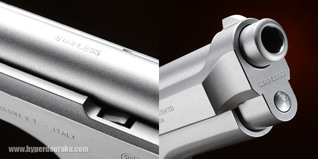 アウターバレル上部と、マズル下のスライド前面には「STAINLESS」の刻印が入る。この刻印があってこそのINOXと言える。トイガンファンとしては譲れない部分だ。