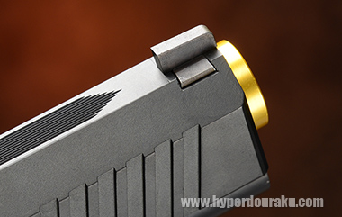実際のところ、SAIには本モデルと全く外観が一致するモデルはリリースされていないが、いかにもSAIによってカスタムされたかのようなパーツがふんだんに盛り込まれており、スライドの加工、ゴールドに輝くバレルも美しい。またドットサイトにより、素早いエイミングが可能で、最新の1911タクティカルカスタムをハンドリングしているという気分を盛り上げてくれる。