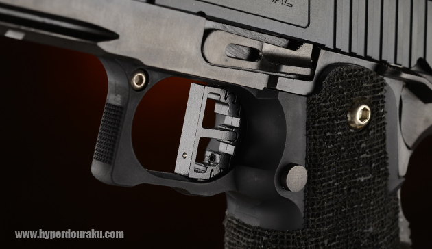トリガーは金属製でストレートロングタイプを採用する。トリガーのタッチや切れに硬質感があり、気持ちいい。また、トリガーガード下部は削り込まれており、よりハイグリップが可能となっている。