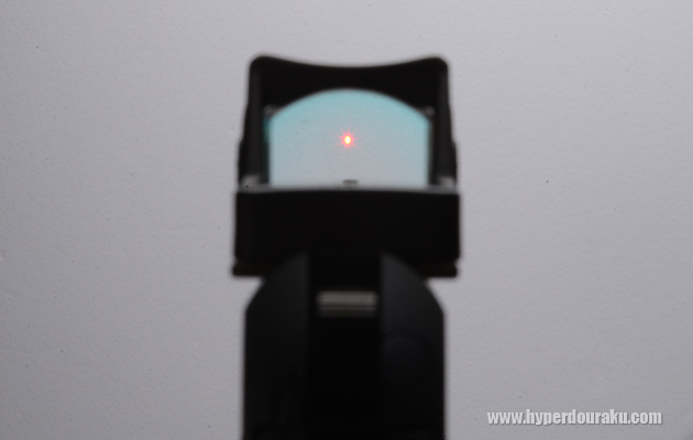 ドットの輝度は左右側面の(+)(-)ボタンで4段階で調節可能。マイナスボタンを数回押して最少輝度以下になると消灯する。上下左右のドット調節も可能。ただ、ちょっとしたことでドット位置が狂いやすいので、撃つ前にはゼロイン調整を行ったほうが良いだろう。