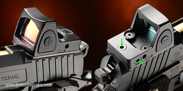 Trijicon RMRタイプのマイクロドットサイトがスライドに載っている。スライド後部を切削加工し、スチール製の平らなマウントに搭載されており、強度も問題なさそう。