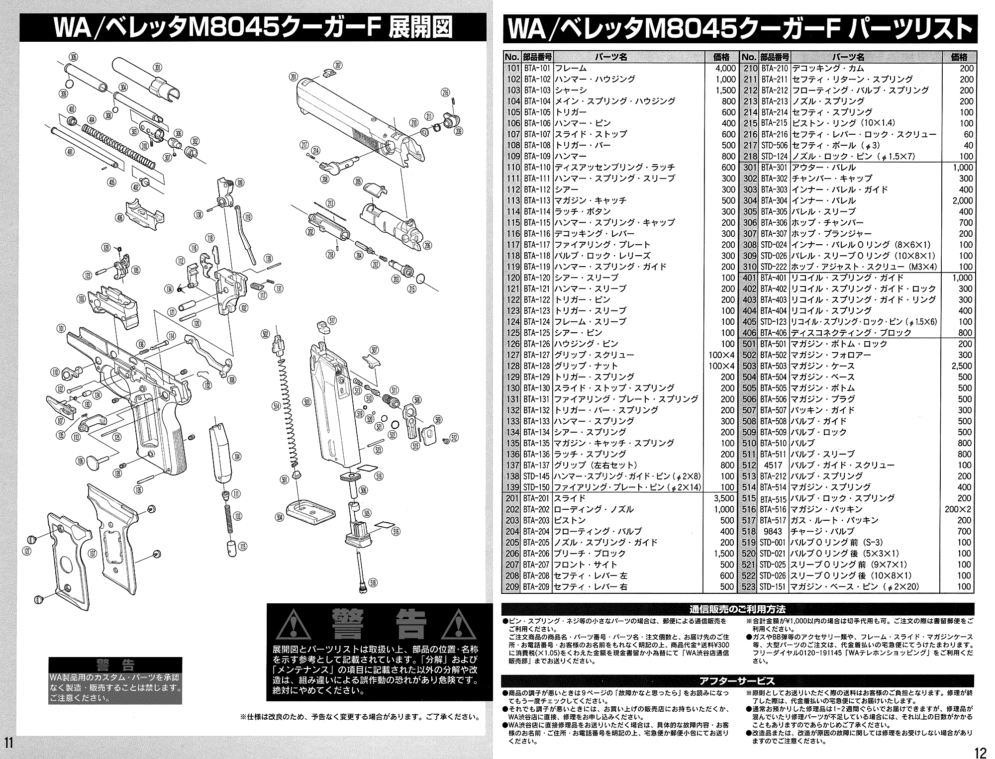 WAのM8045クーガーはベレッタ社との提携により実銃用図面の提供を受けて設計された正確な外観を実現している。しかもSCWハイスペックシステムを導入し、トランスファーハンマーシステムや、6.03mm精密NEW固定HOPバレルといった、最新の機能を満載、しかもカーボンブラック・ヘビーウェイト樹脂採用で、使い古された金属のような味わい深い質感と、959gという実銃以上の重量感。実銃のM8045の空重量は925gで、.45ACP弾の8発装填時に匹敵する。